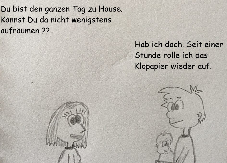 … dann abends so da sitzt, der Partner nach Hause gekommen ist und sich gerade noch einen Kommentar verkneifen kann, warum denn nicht aufgeräumt und gekocht ist. Schließlich hat er den ganzen Tag gearbeitet und nun endlich mal seine Ruhe verdient. Und was genau wurde denn den ganzen Tag hier gemacht, wenn es nicht mal zum Aufräumen gereicht hat?