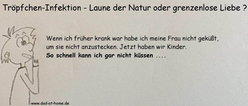 Im Morgenkreis singen wir heute „Der Herbst ist da“. Ich kann es nicht mehr hören. Aber leider lebt es sich halt vor allem in Herbst und Winter so richtig gut im Kindergarten. Sommer und Frühling sind mir irgendwie zu trocken, da fühle ich mich gar nicht wohl. Da mache ich quasi meinen Sommerschlaf und verpasse daher meistens die Sommerlieder. Das gute am Singen ist, daß man bei Langeweile den einen oder anderen Tröpfchen-Trip machen kann. Schließlich kommt es beim Singen öfter mal vor, daß auch ein bisschen Spucke den Mund verlässt. Aber Vorsicht, diese Trips sind nicht ganz ungefährlich. Schließlich kann es dabei schnell passieren, daß man auf dem Teppich landet und vergessen wird. Man kann ja viel von Kindern erwarten, aber daß sie ihr Gesicht auf dem Boden reiben passiert einfach zu selten. Also geht es dann nur noch über Zwischen-Stationen wie Kleidung oder Hände und Füße. Und das ist sehr mühsam und kann lange dauern. Ich mache sowas nicht. Dazu habe ich schon zu viele meiner Familien-Mitglieder beobachtet, wie sie sich auf dem Boden zu Tode langweilen. Ich bevorzuge die sichere Variante und warte lieber immer ab, bis ich ziemlich sicher auf ein anderes Kind, oder zur Not auf einen Erwachsenen umsteigen kann. An der Stelle sei erwähnt, dass Tom ein hervorragender Gastgeber ist. Beim Singen popelt er in der Nase und setzt mich damit genau dahin, wo ich hin wollte. Herrlich, ich bin im Paradies gelandet. Hier ist noch alles frisch und meine Familie hat sich auch noch nicht so richtig breit gemacht. Ran an die Arbeit. Ein Ort zum Wohlfühlen, auch wenn immer mehr meiner Familienmitglieder nachkommen. Tom hat sich zwar die Hände gewaschen, aber ohne Seife. Deswegen sind zwar leider ein paar von uns im Waschbecken gelandet, aber wirklich nur ganz wenige. Und Tom popelt fröhlich weiter und reibt sich immer öfter die Nase. Ich glaube er ahnt schon etwas…